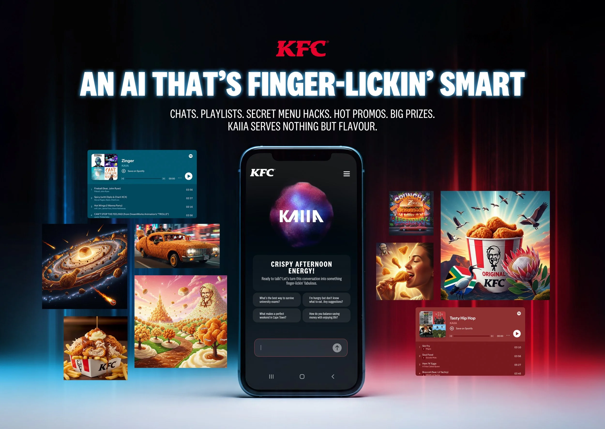 KAIIA, our KFC-obsessed AI, generated a flood of wildly creative images — each one infused with her unmistakable love for KFC. From playful pop culture mash-ups to totally unexpected twists, no two creations were ever the same. Here’s just a taste of what she came up with.